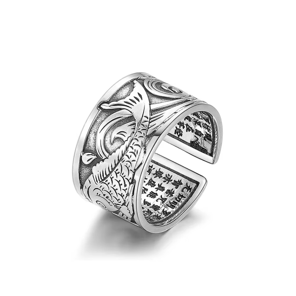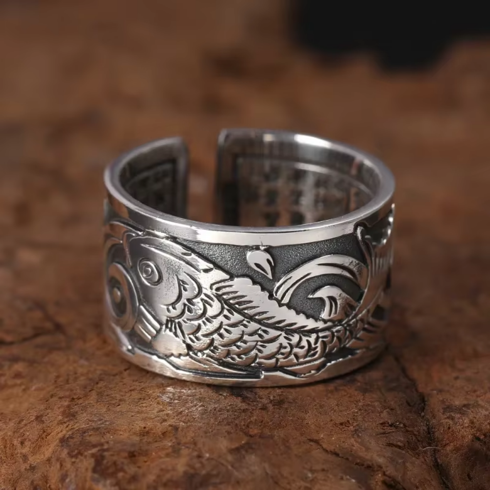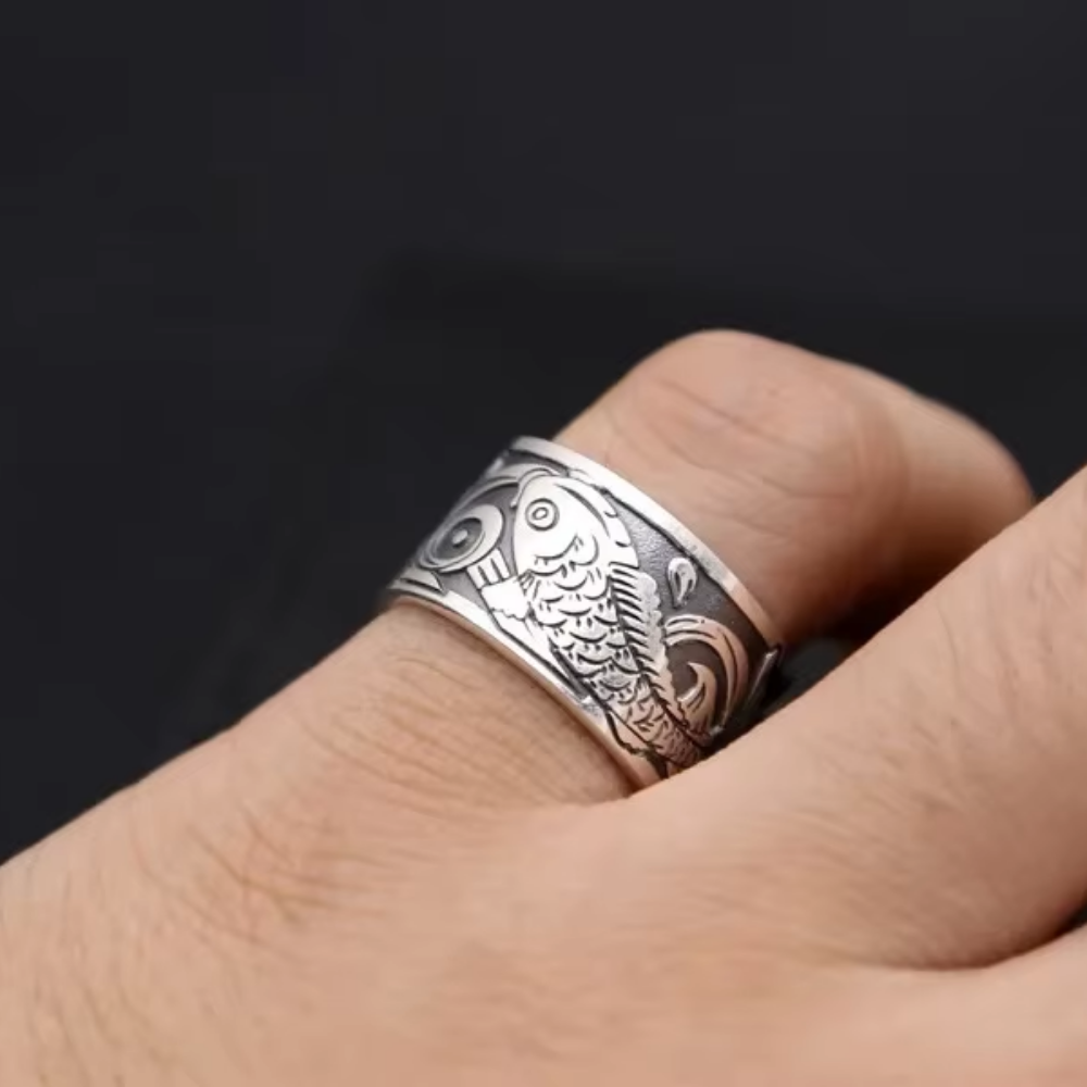 O Anel Koi tem um design com uma carpa em sua superfície, remetendo a cultura e tradição japonesa. ele é feito em titânio e possui tamanho ajustável.