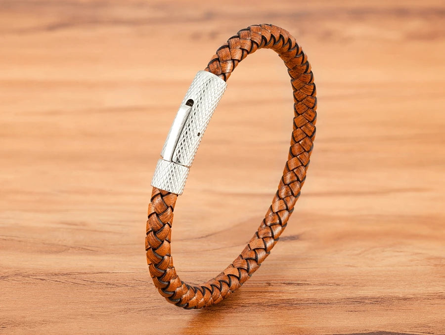 Uma Pulseira Masculina de Couro com Fecho Magnético em Inox