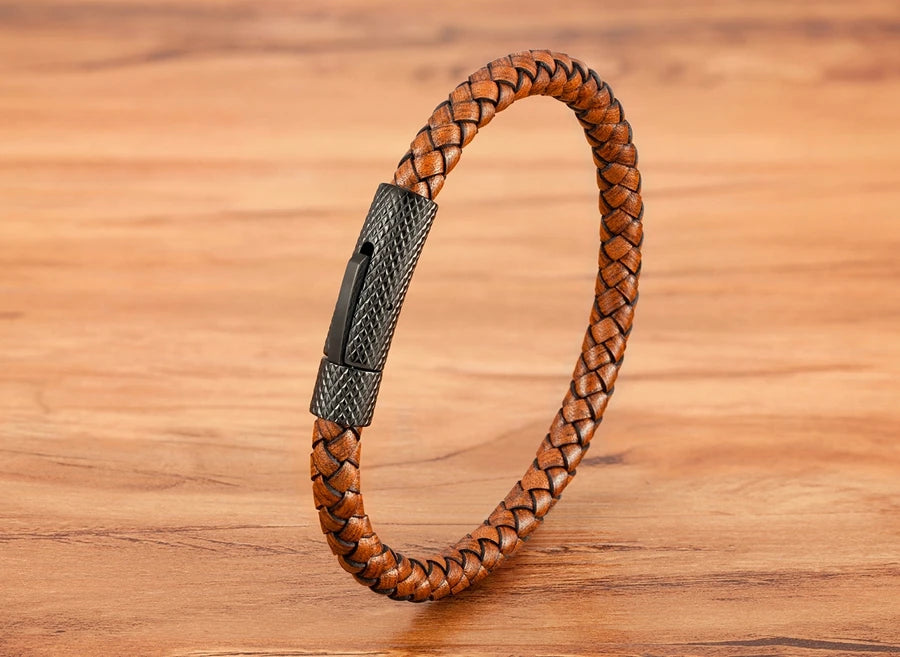Uma Pulseira Masculina de Couro com Fecho Magnético em Inox