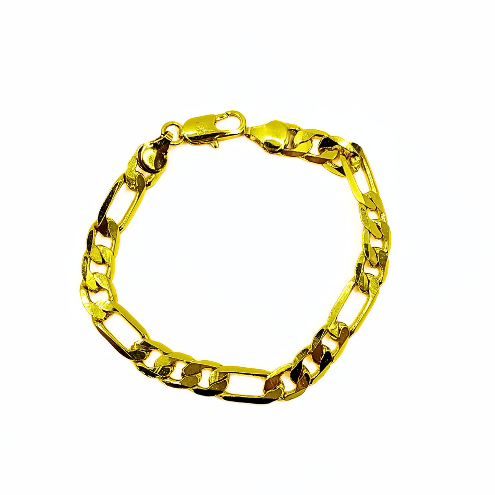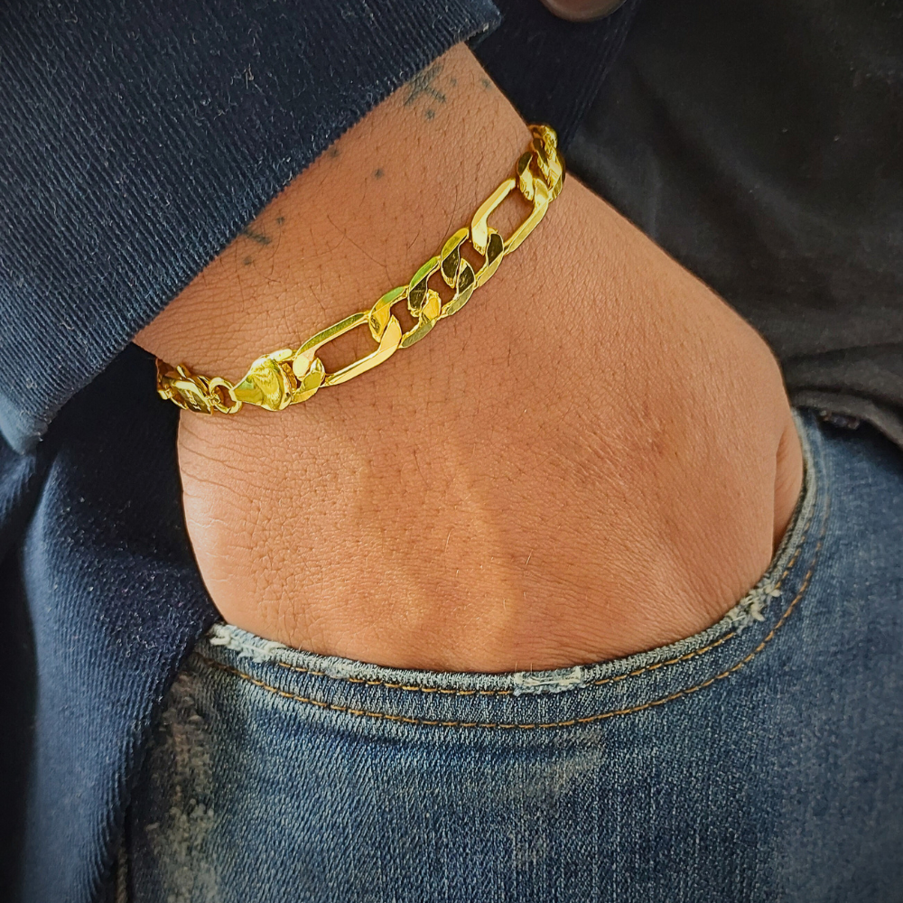 A Pulseira Yves é uma peça de destaque, com uma corrente grossa de 6 mm em estilo Figaro clássico, projetada para atrair olhares. Banhada em ouro 18k, ela é ideal para homens que valorizam um estilo robusto e sofisticado.