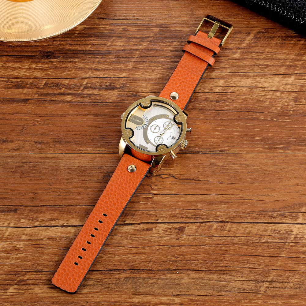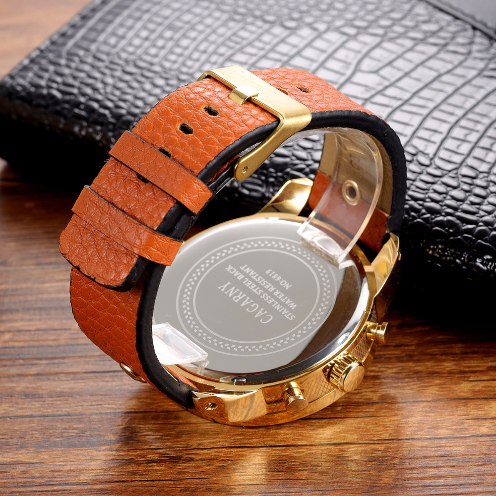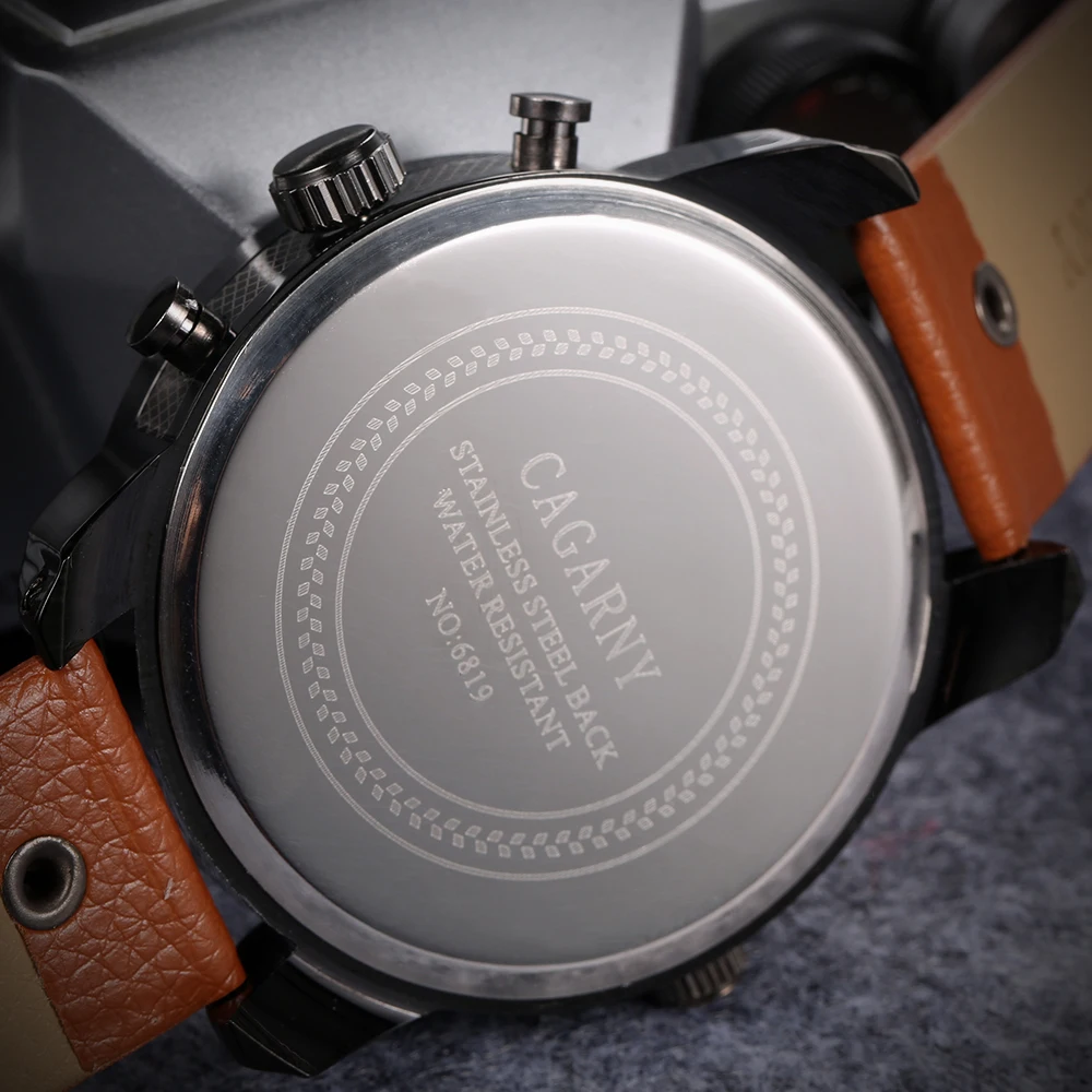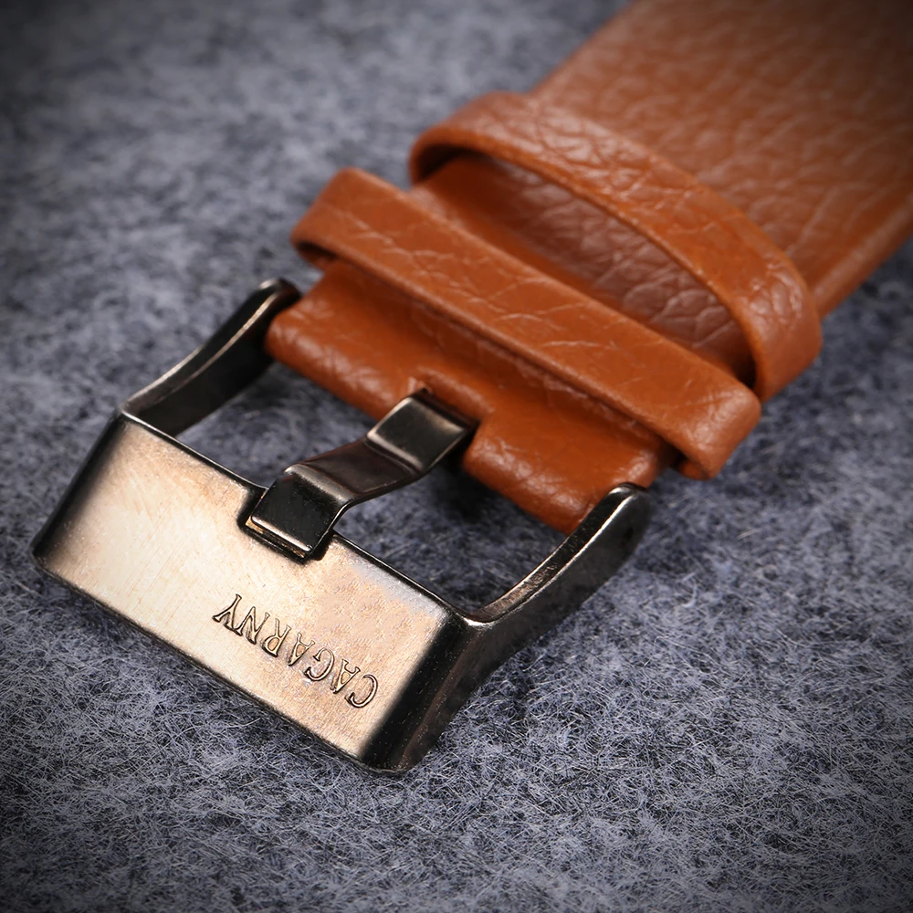 Relógio da marca Cagarny, com pulseira em couro, caixa em metal inoxdidável, movimentos em quartzo e um design moderno e casual