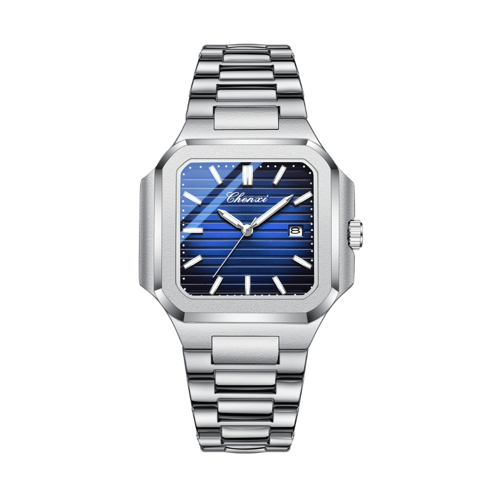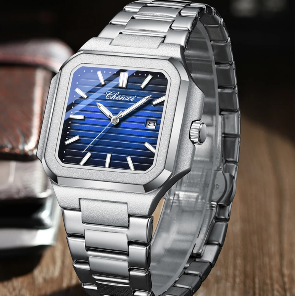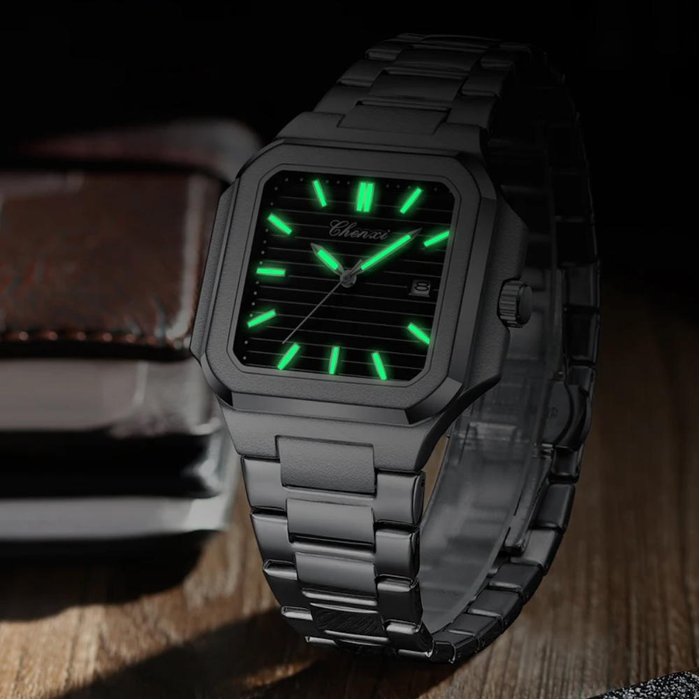 Relógio da marca Chenxi, com design totalmente cromado, movimentos em quartzo, ponteiros luminosos no escuro e um design compacto e elegante que se adapta perfeitamente ao seu pulso.