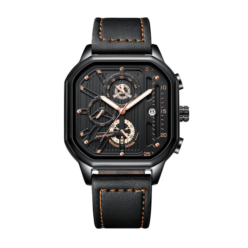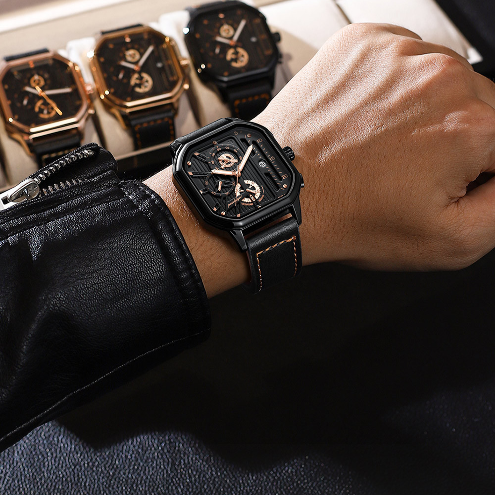 Relógio da marca Suiça Poedagar, com design translúcido mostrando todo o maquinário, detalhes em dourado e pulseira em couro. Função cronômetro e vidro cristal