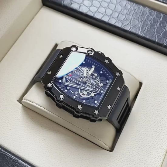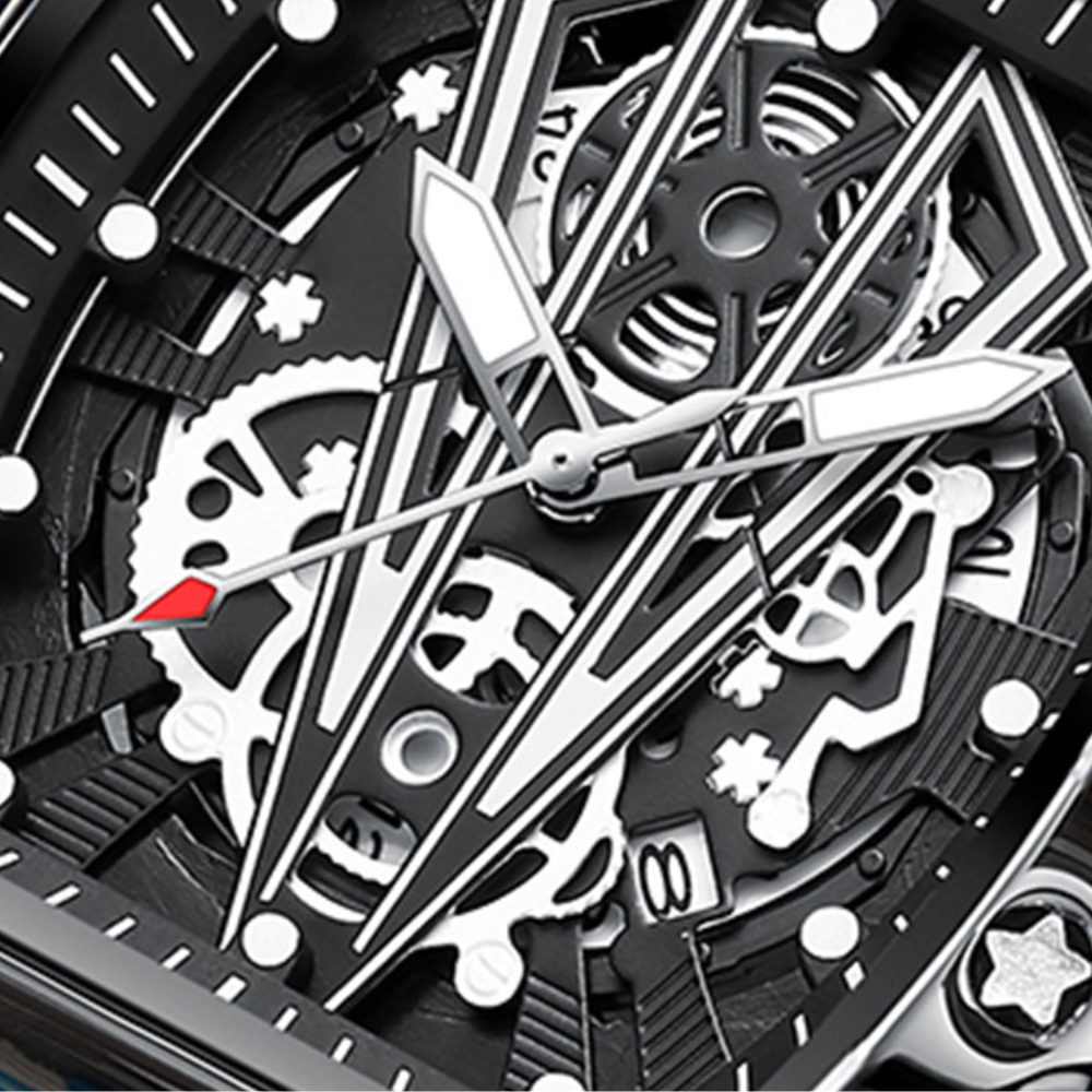 Relógio da marca Suiça Poedagar, com design translúcido mostrando todo o maquinário funconamento e sofisticação por dentro do relógio. Função cronômetro e vidro de de cristal